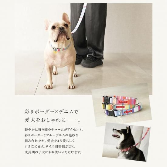 永遠の若さの象徴ブルーデニムと組み合わせたマルチボーダーの首輪にモンシロチョウが揺れる楽しい首輪です。