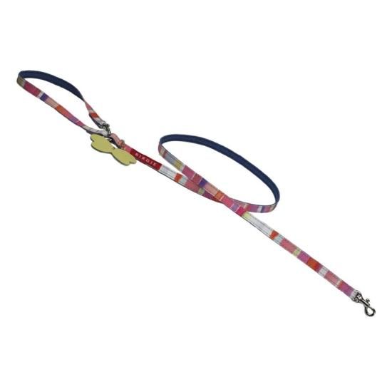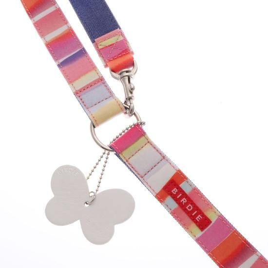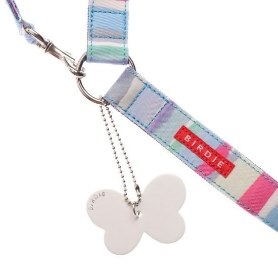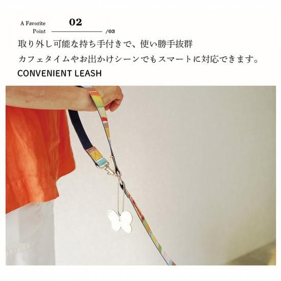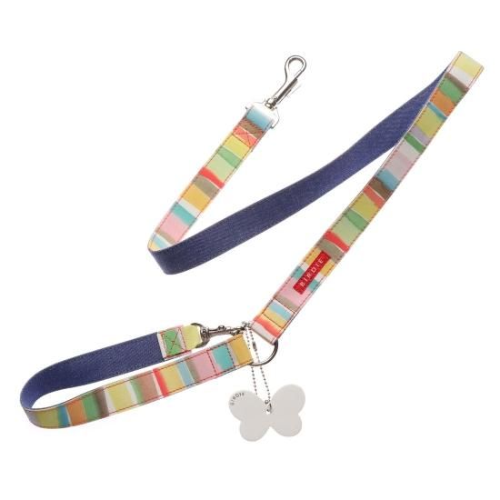 永遠の若さの象徴ブルーデニムと組み合わせたマルチボーダーの首輪にモンシロチョウが揺れる楽しいリードです。